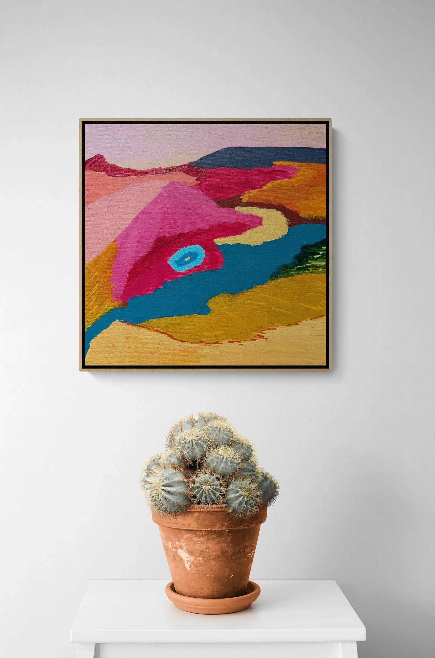 - Ember Valley is an abstract interpretation of the Australian landscape, where scorched earth meets the resilience of life. Painted in acrylic on stretched canvas, this work captures the fiery warmth and raw beauty of a valley shaped by time, sun, and spirit. The vivid pinks, ochres, and deep blues evoke the emotional landscape of bushfires, dry riverbeds, and the sacred silence that follows. Through layered colours and intuitive forms, I reflect on nature’s ability to burn, regenerate, and endure—drawing inspiration from the Australian outback and its quiet, powerful stories. This valley, though imagined, holds the embered essence of Country.