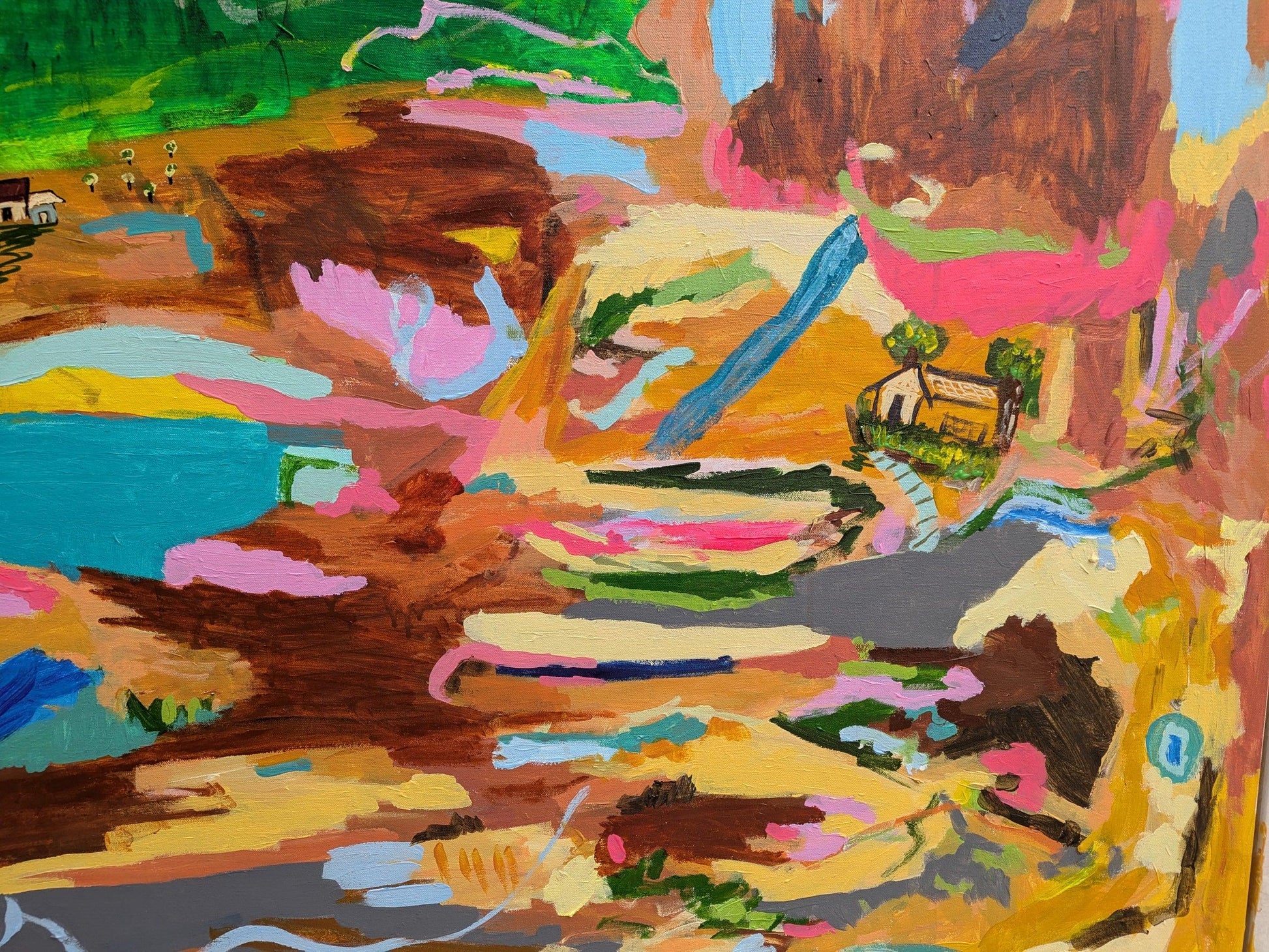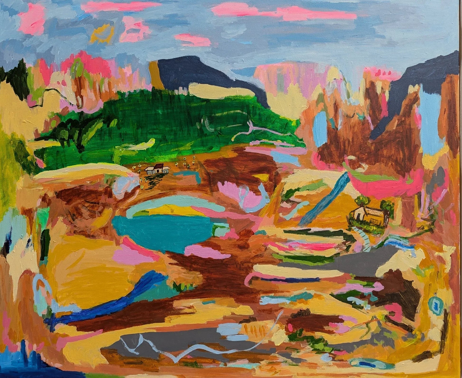 Inspired by the rugged and captivating Australian landscape, Family Weekend is a vivid portrayal of my visit to the rolling farm hills of New South Wales. The composition is a blend of memory and imagination, capturing the essence of rural serenity intertwined with bursts of vibrant colors. The abstract expression of the landscape conveys the dynamic interplay of natural elements—the lush greenery, winding ponds, rocky terrains, and the humble farmhouse nestled within. Using a brush to create bold, expressive strokes, I sought to capture the fluidity and energy of the landscape while highlighting the contrast between human habitation and the vast, untamed environment. Through this piece, I aim to evoke a sense of wandering through the expansive hills, where nature’s raw beauty and human presence coexist harmoniously. The vivid colors and textured layers reflect my emotional connection to the countryside, celebrating the ever-changing moods of the Australian land. You can also view and purchase this artwork via my Bluethumb profile
