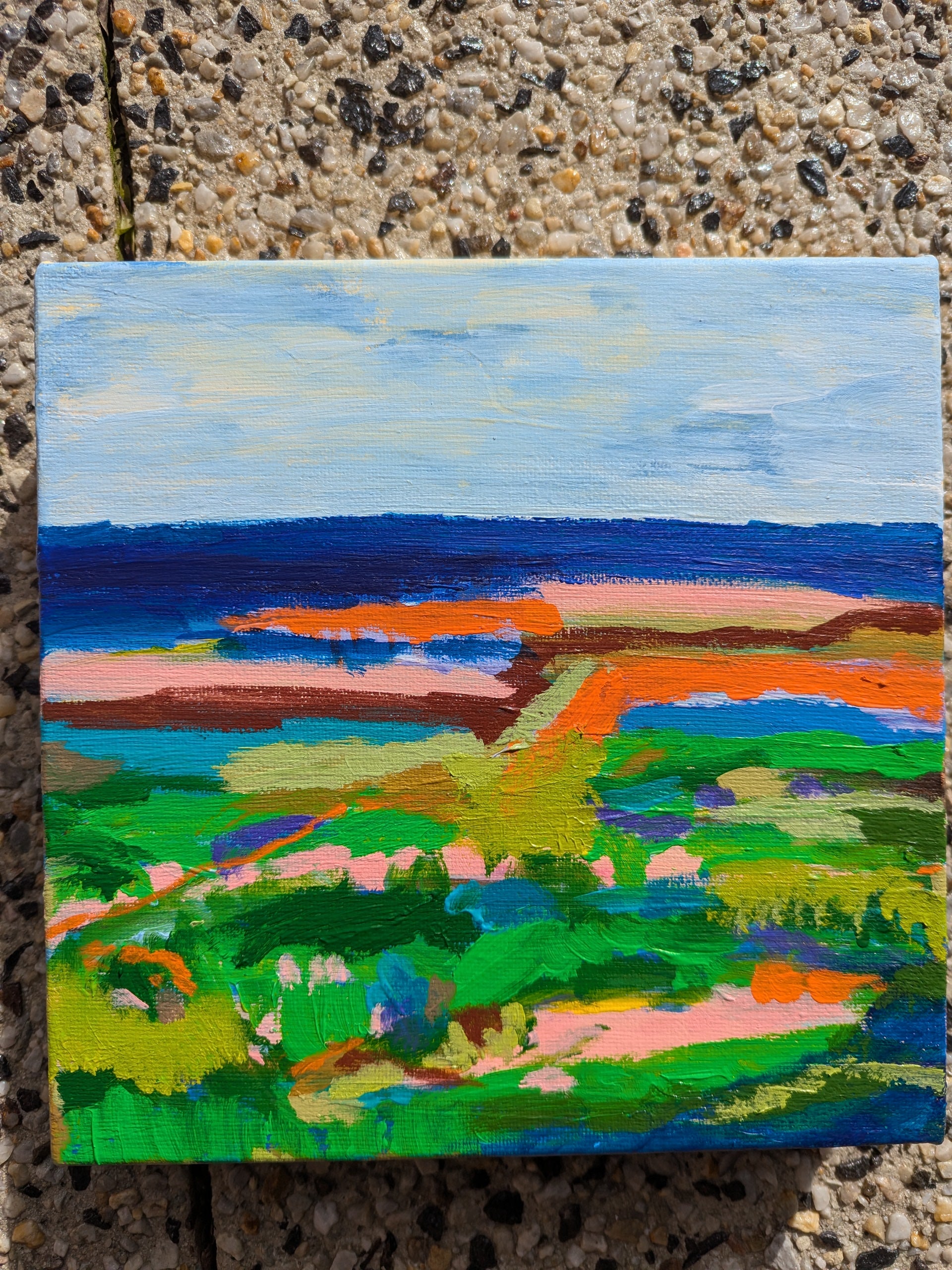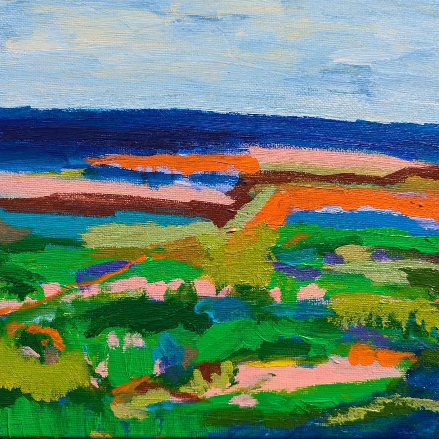 Rather than portraying a literal place, the work evokes the joy of being immersed in nature’s movement—the shifting light, the rolling land, the sense of freedom it offers. It is an invitation to feel the vitality of color and the quiet power of space.