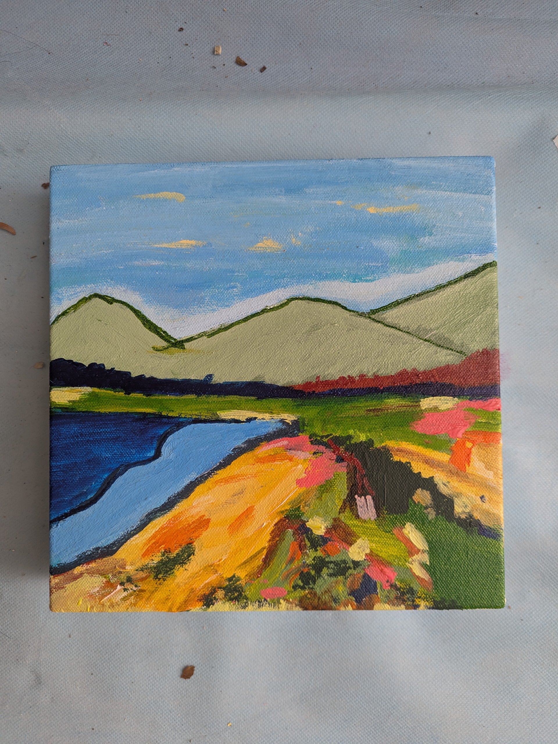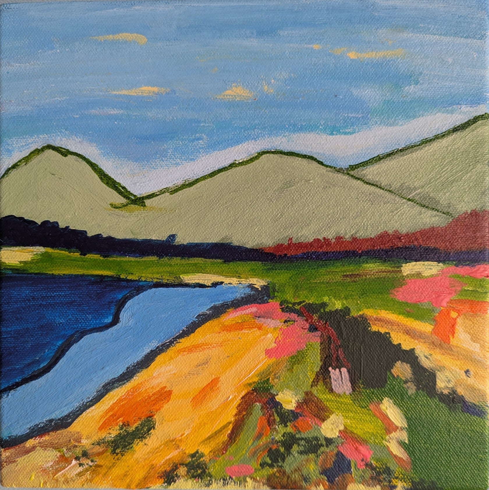 In Golden Path to the Mountains, Alpana Rai reimagines the landscape through bold, expressive colors that transcend literal representation. Warm yellows and soft pinks guide the viewer’s gaze toward distant green peaks, while deep blues of the water introduce a sense of calm. The work reflects Alpana’s fascination with nature’s ability to stir emotion—capturing not just a place, but the joy and wonder of journeying through it. Using layered acrylics and simplified forms, she transforms a fleeting moment in the landscape into an enduring memory shaped by both reality and imagination.