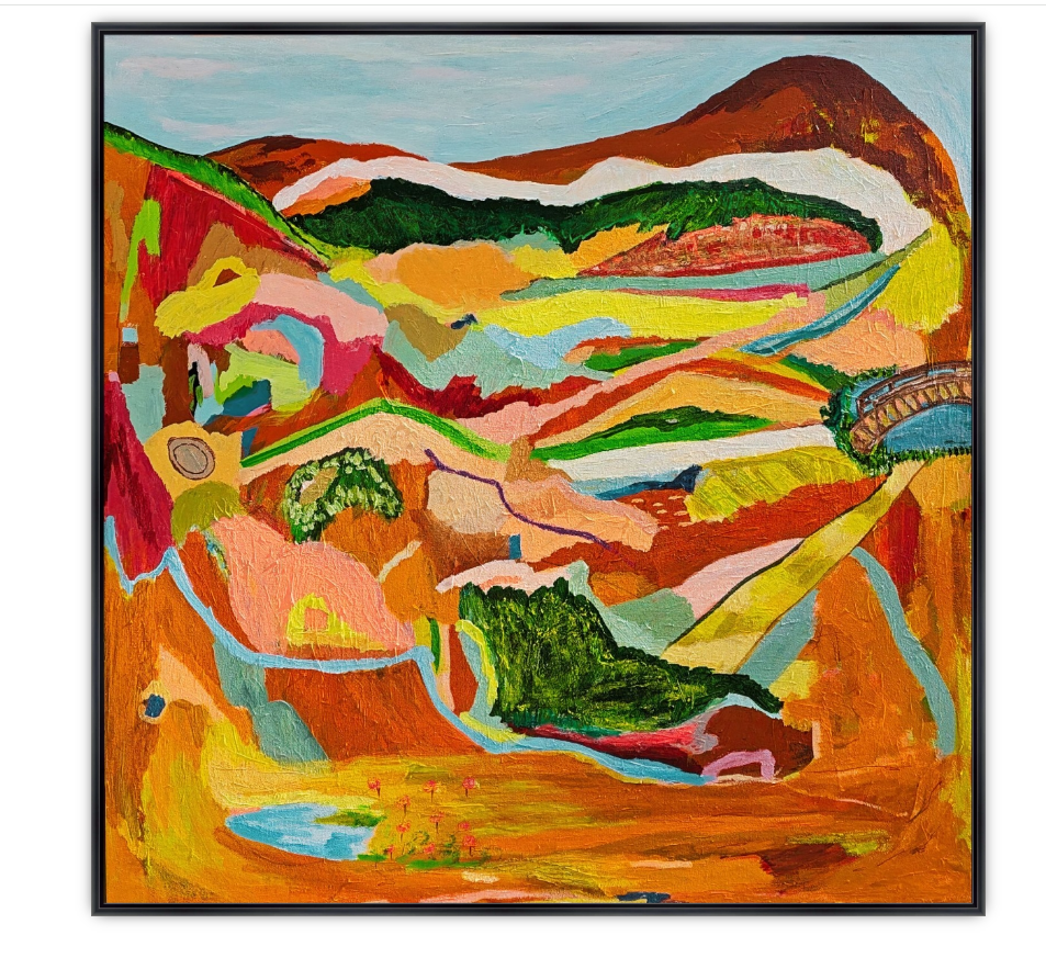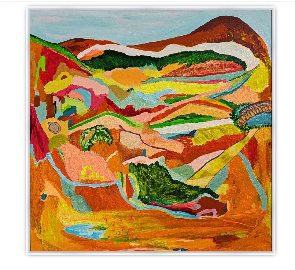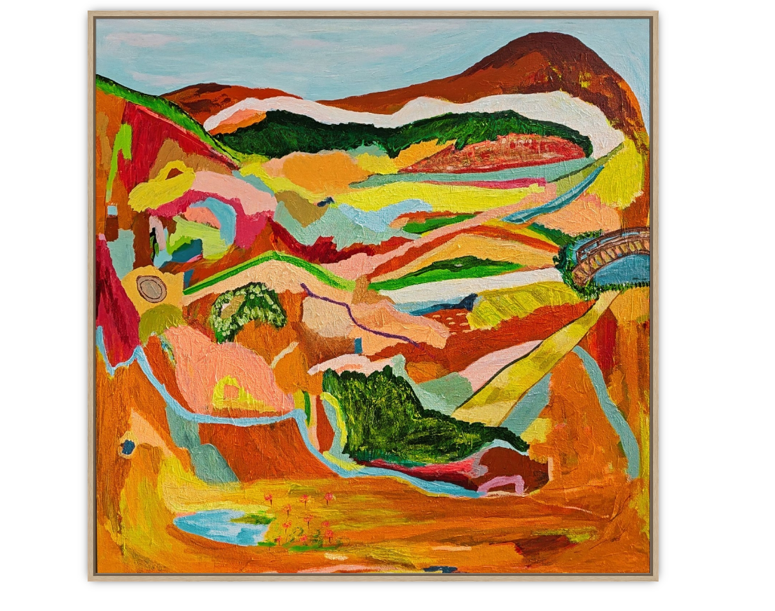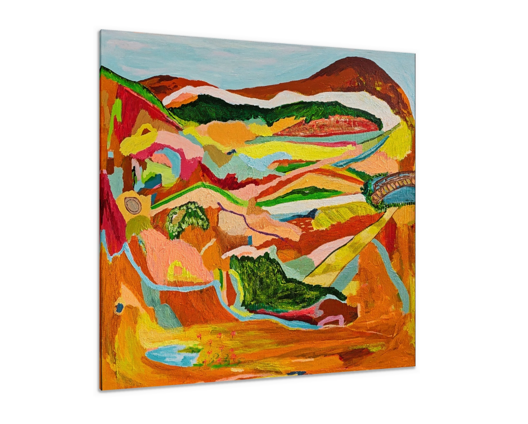 The vivid palette mirrors a world both real and imagined — where soft greens hint at renewal, radiant oranges warm the earth, and sky blues offer breath and release Fine art print from an original abstract landscape painting By Alpana Rai
