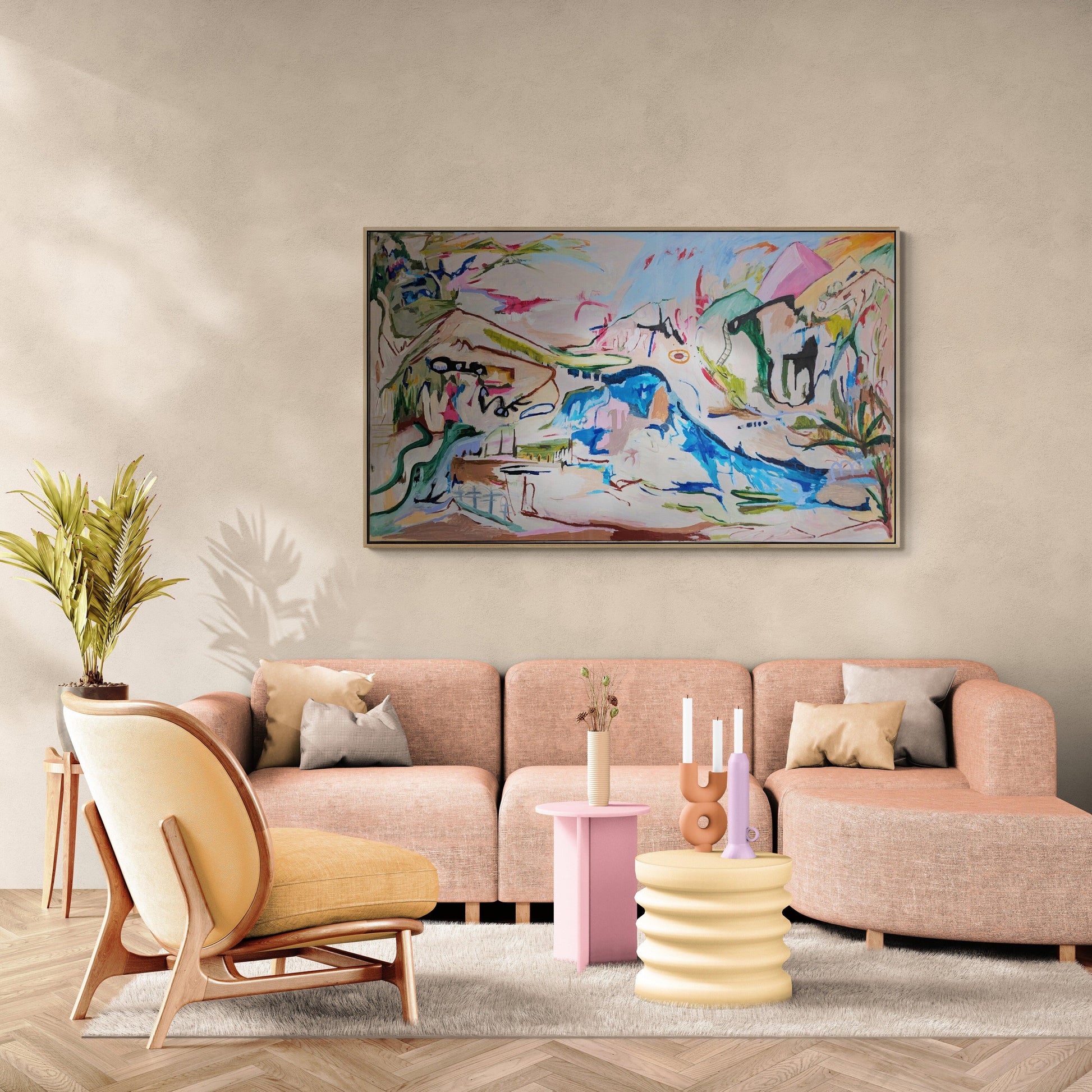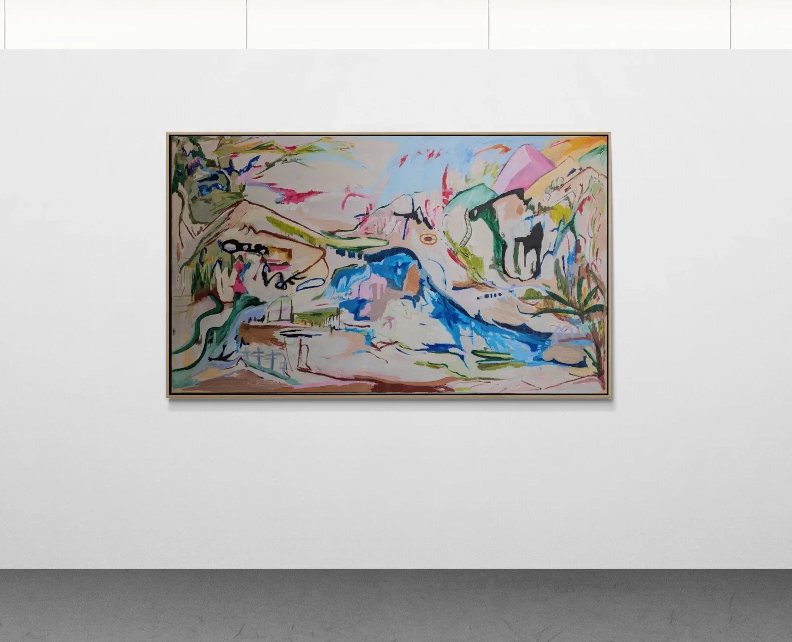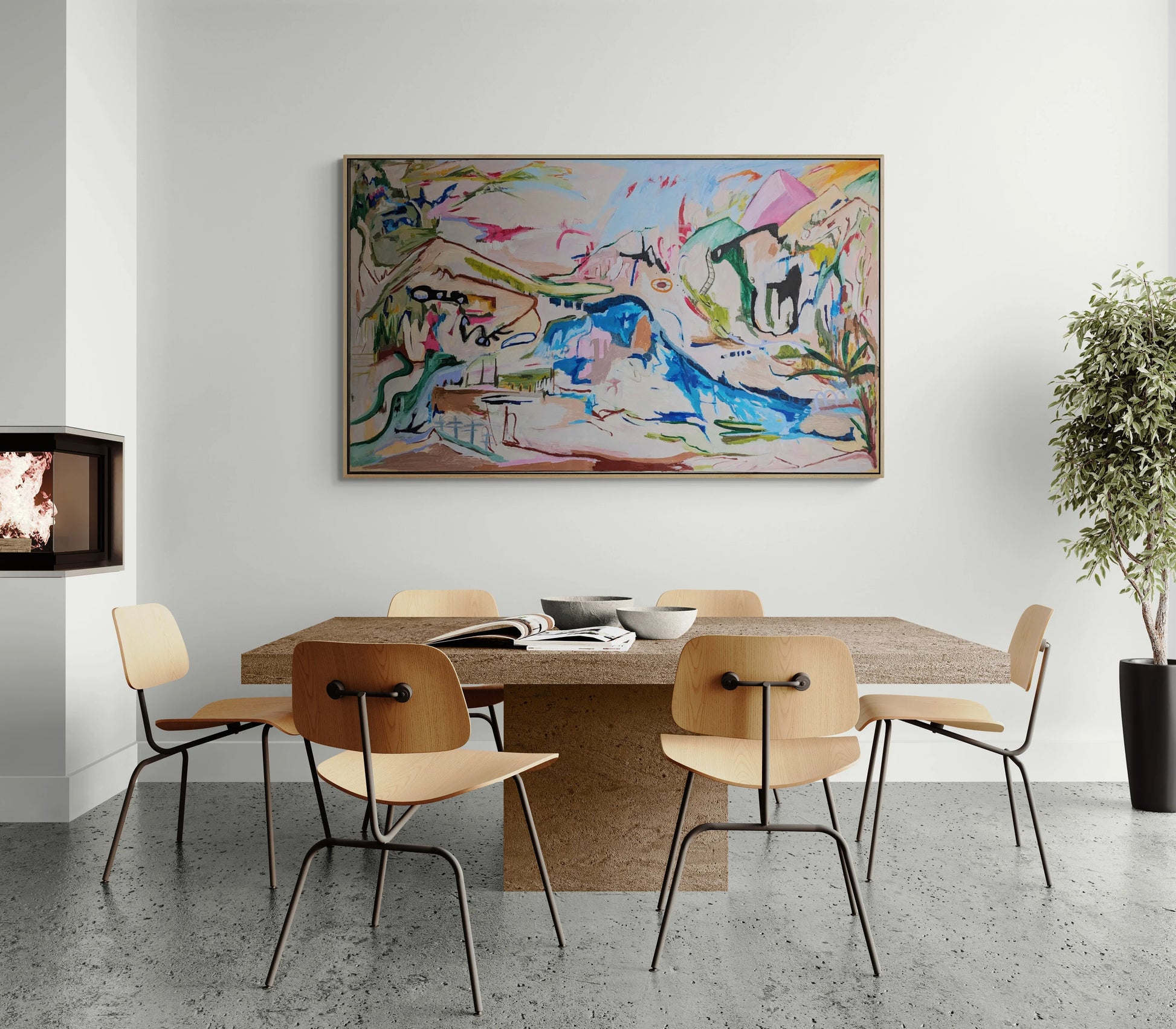 This artwork, titled "Interwoven Landscapes," is a reflection of the complex relationship between nature and human perception. The piece draws inspiration from the fluidity of the natural world, where boundaries are often blurred, and forms are intertwined. The vibrant colors and dynamic shapes represent the constant motion and evolution of landscapes as seen through a subjective lens.