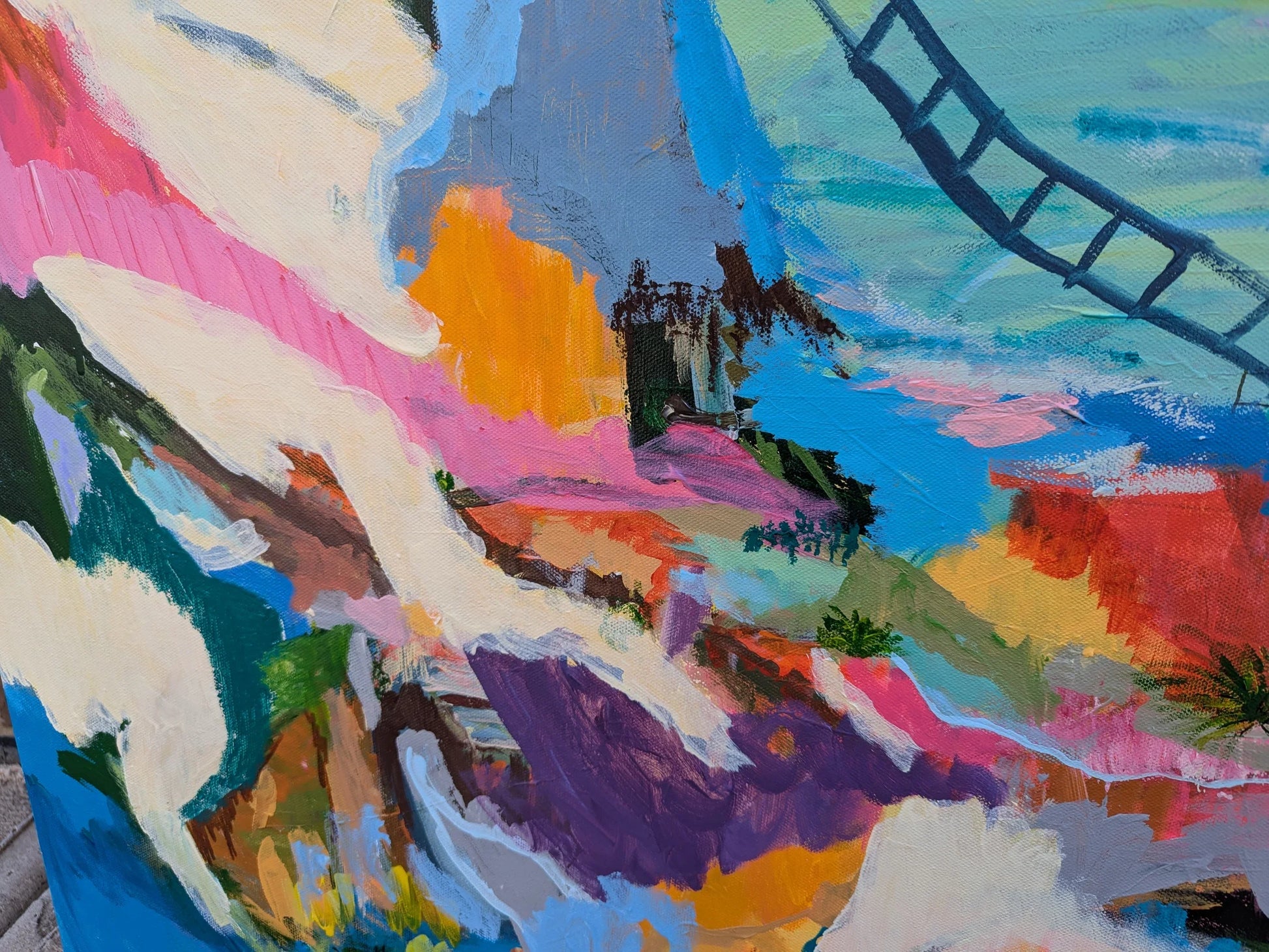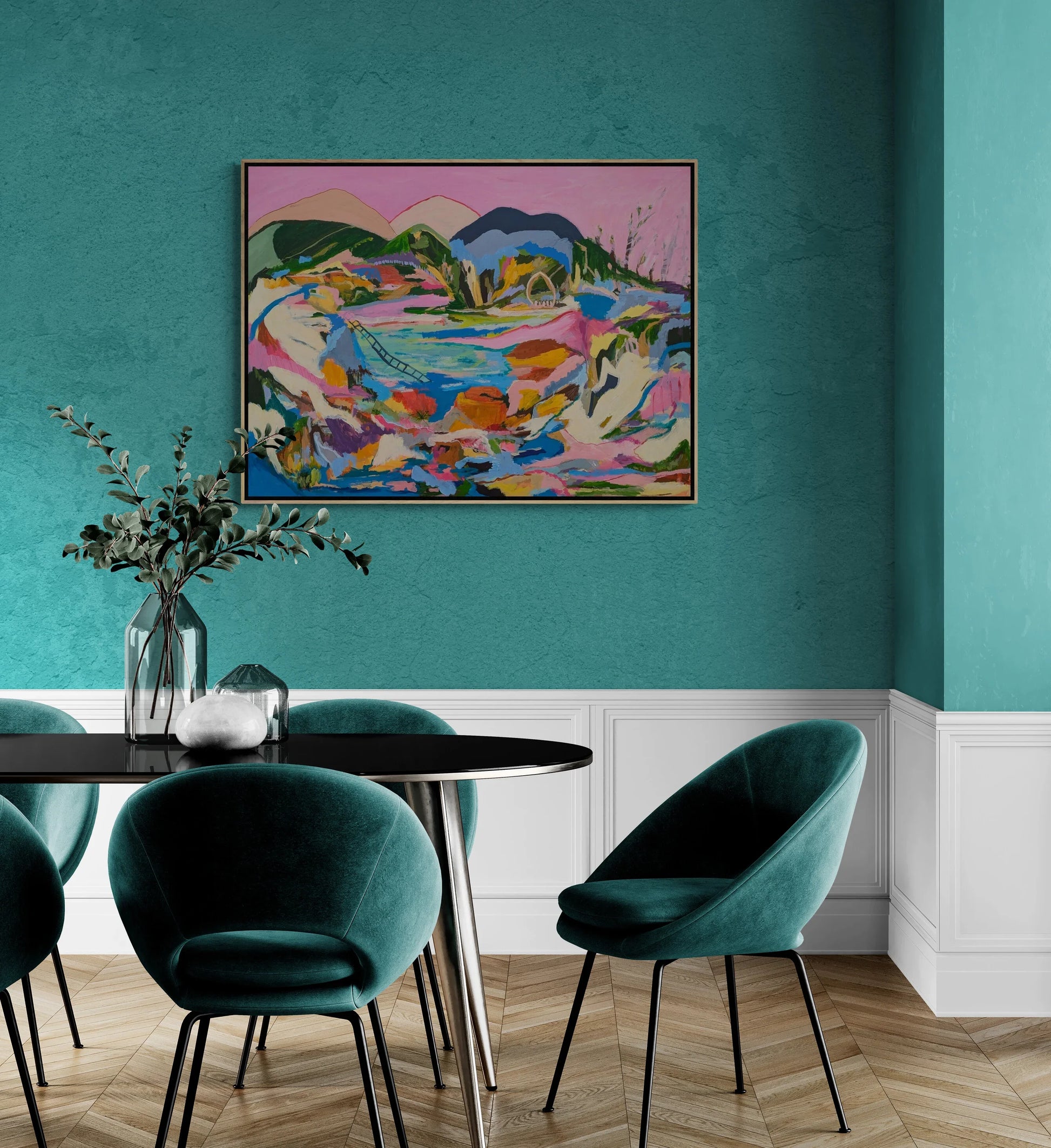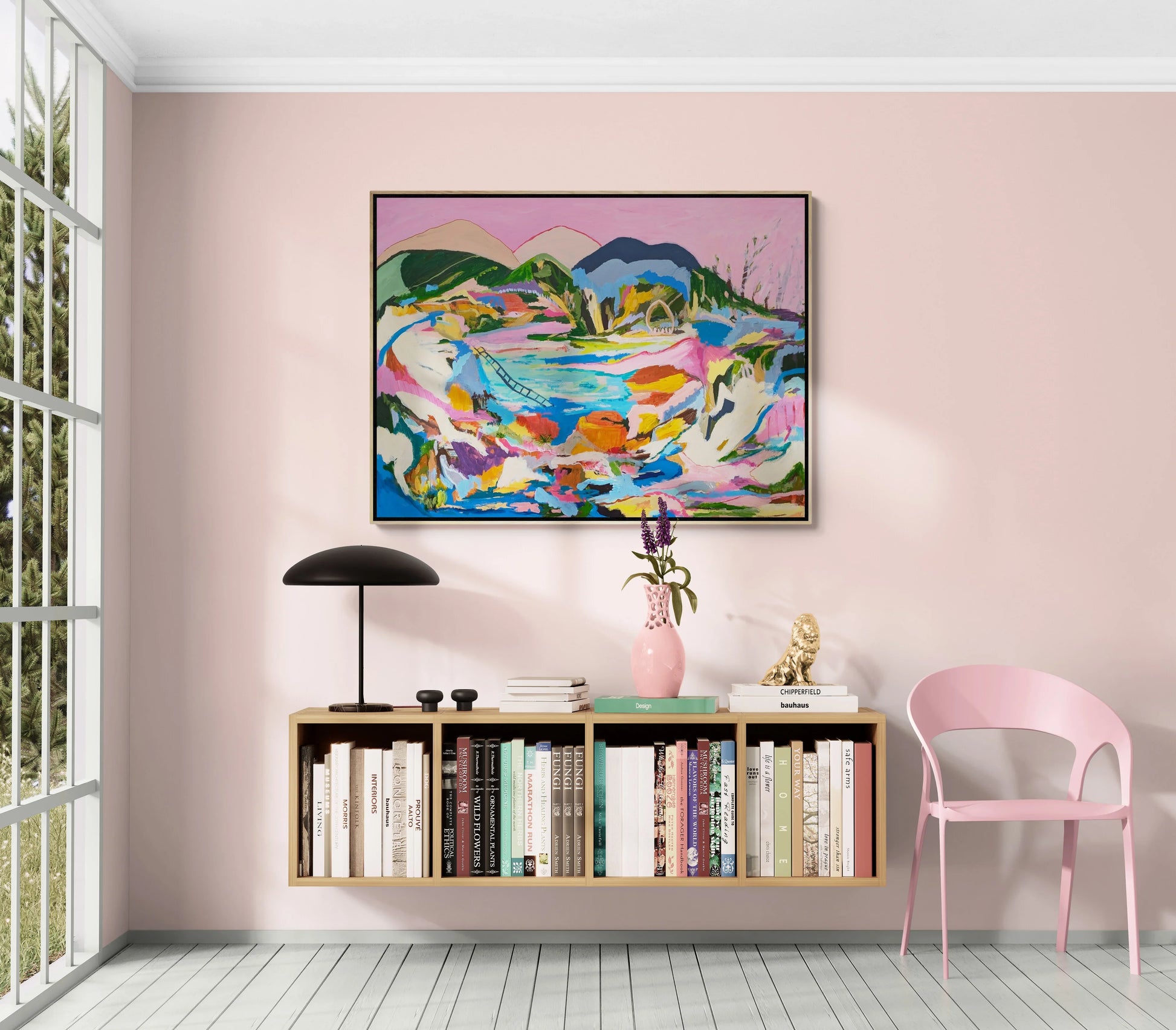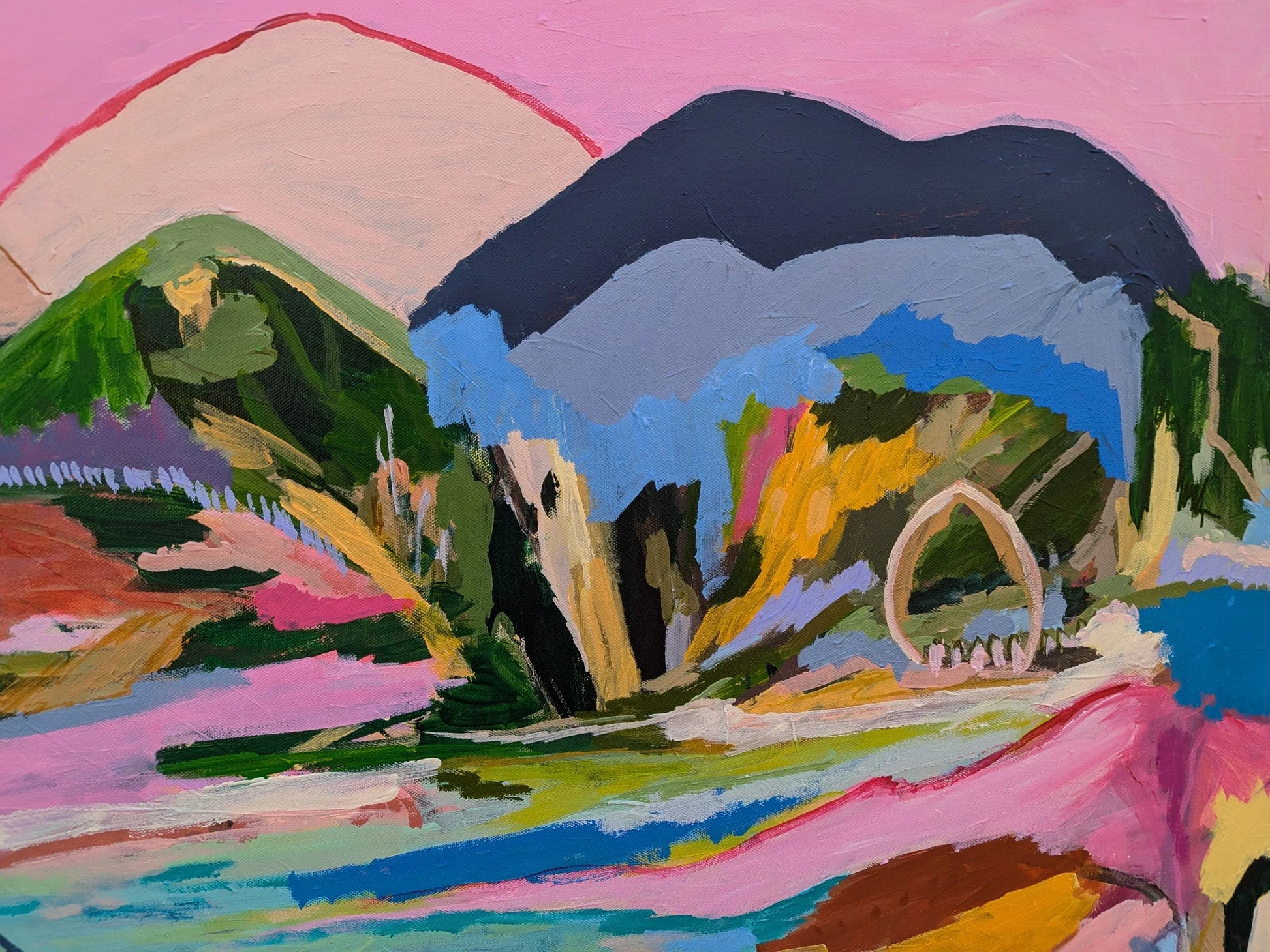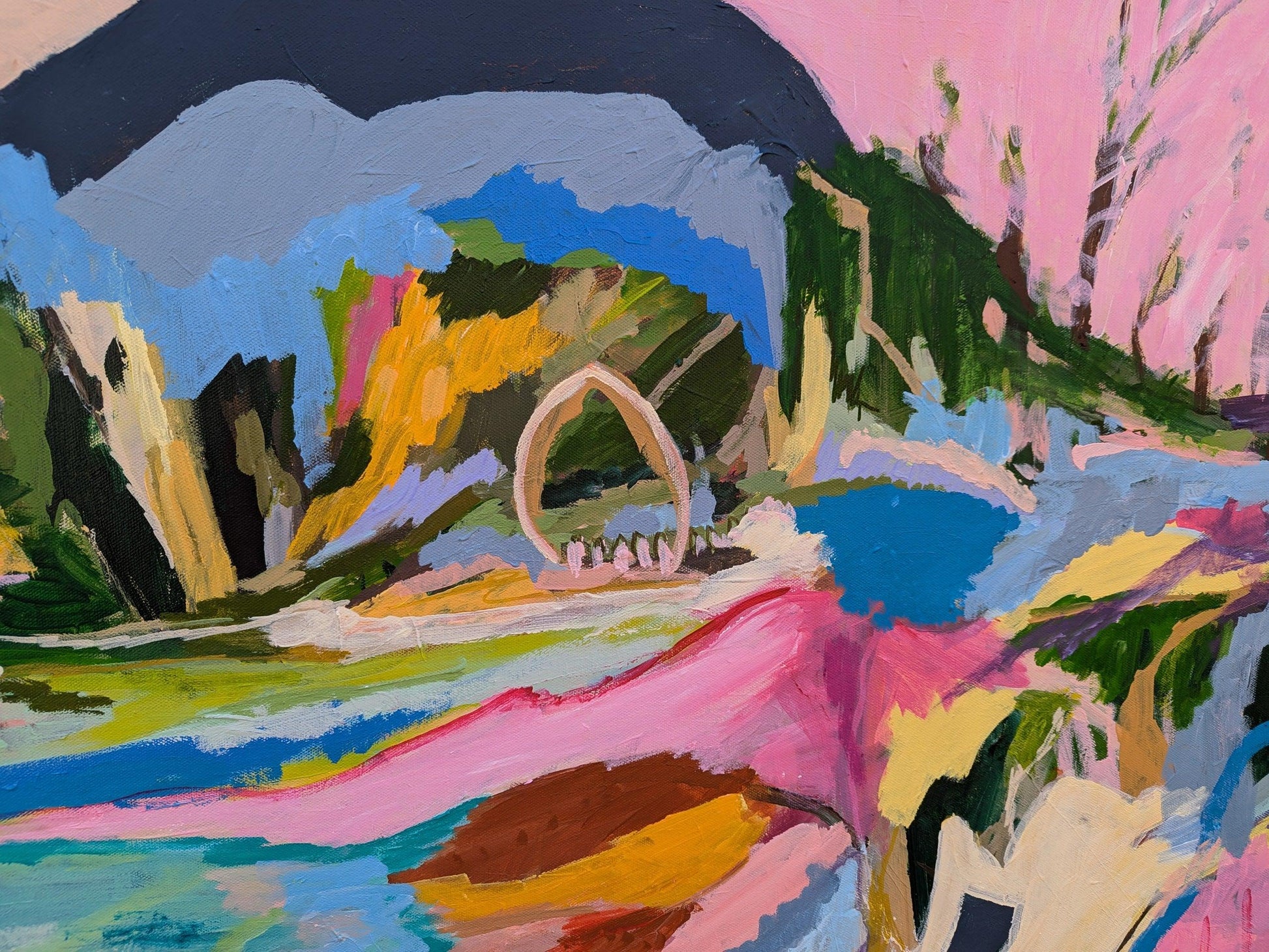 This artwork, with its vivid palette and dynamic, abstract composition, reflects my ongoing exploration of the interplay between memory, place, and the subconscious. Through bold, interconnected brushstrokes and layers of contrasting color, I aim to capture the energy and emotion of landscapes, both real and imagined. The pink sky and organic forms suggest an otherworldly environment, where familiar elements of nature blend with the unknown, evoking a dreamlike sense of place.