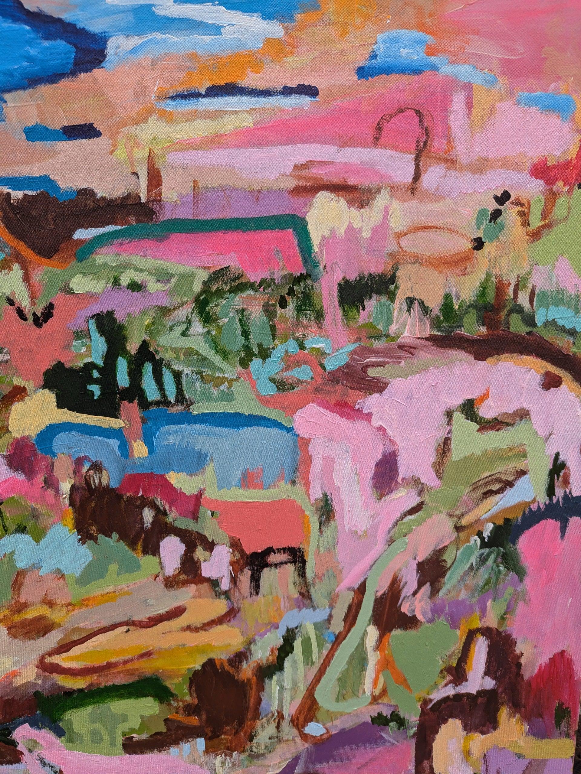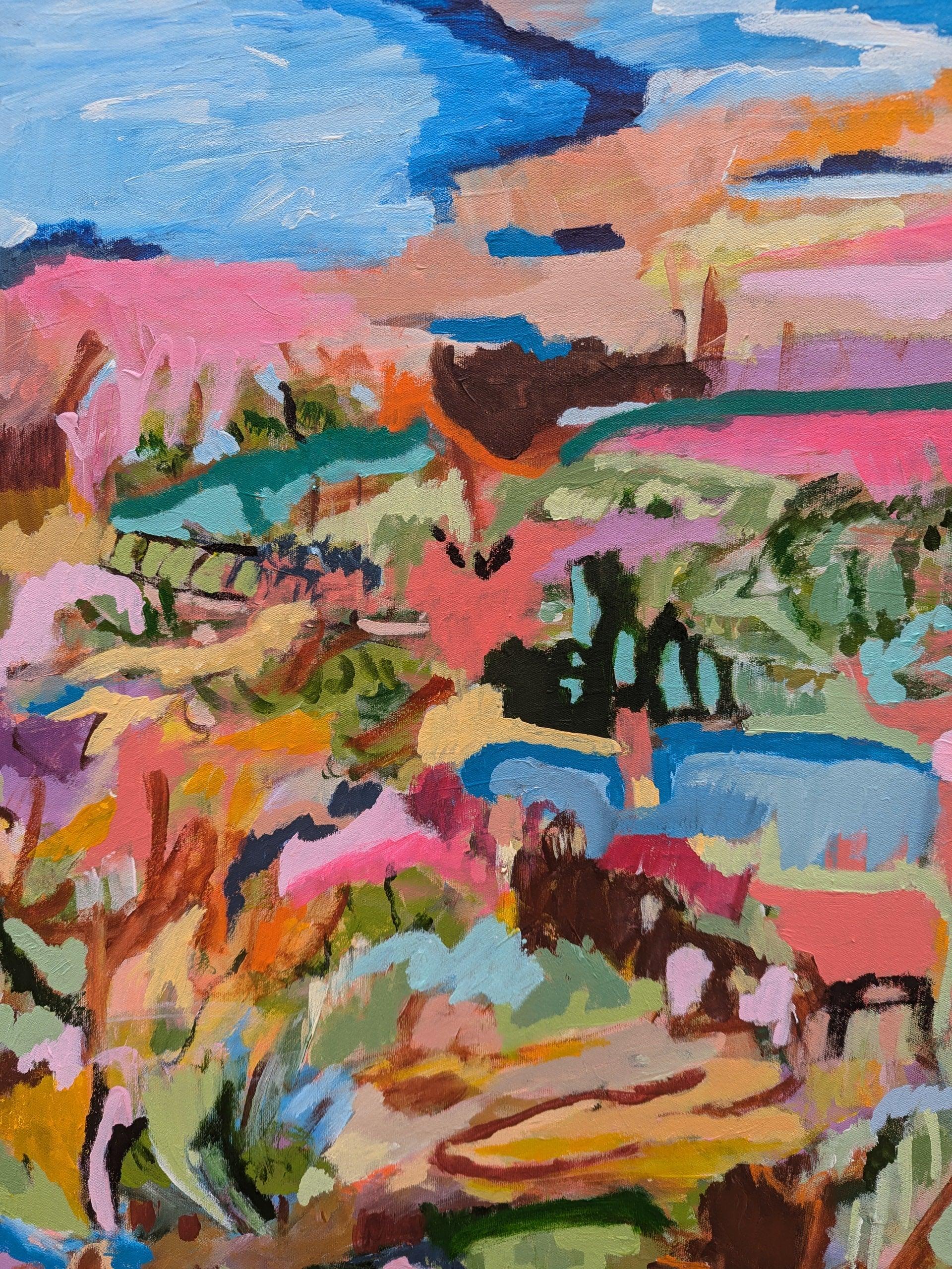 In this artwork, Alpana explored the vibrant and chaotic interplay of colors, forms, and emotions, capturing a sense of fluidity in the landscape that transcends realism. Using bold strokes and a vivid palette, Alpana aimed to create an immersive environment that feels both familiar and surreal. Each layer of color represents different natural elements—sky, water, foliage—melding together in an abstract tapestry. Rather than depicting a specific place, the painting evokes the essence of a landscape in constant flux, encouraging the viewer to experience the energy and movement within the scene. Through this piece, Alpana invite viewers to lose themselves in the organic forms and to interpret the landscape in their own way.