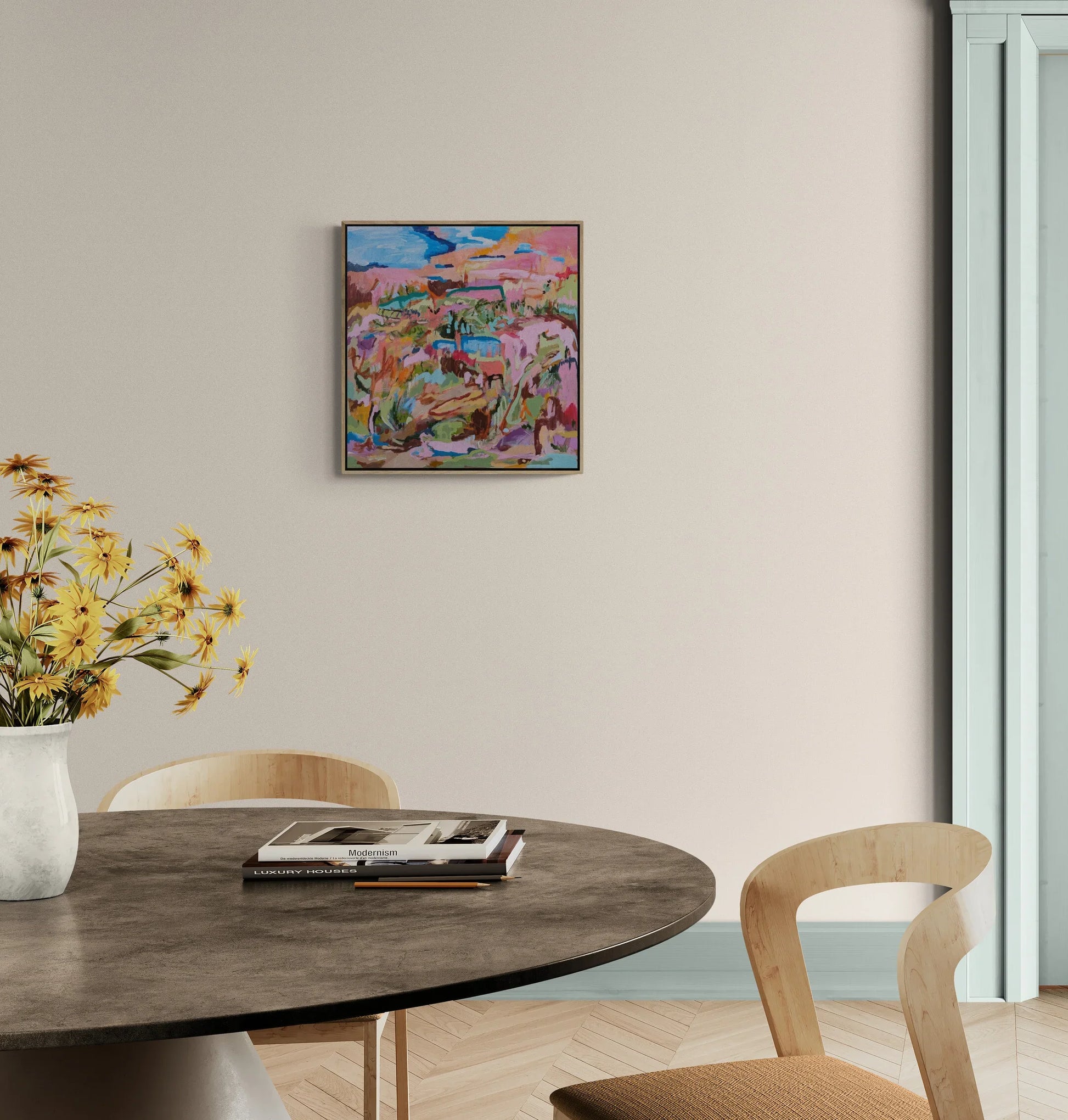 ** Painting is Framed in Natural Oak