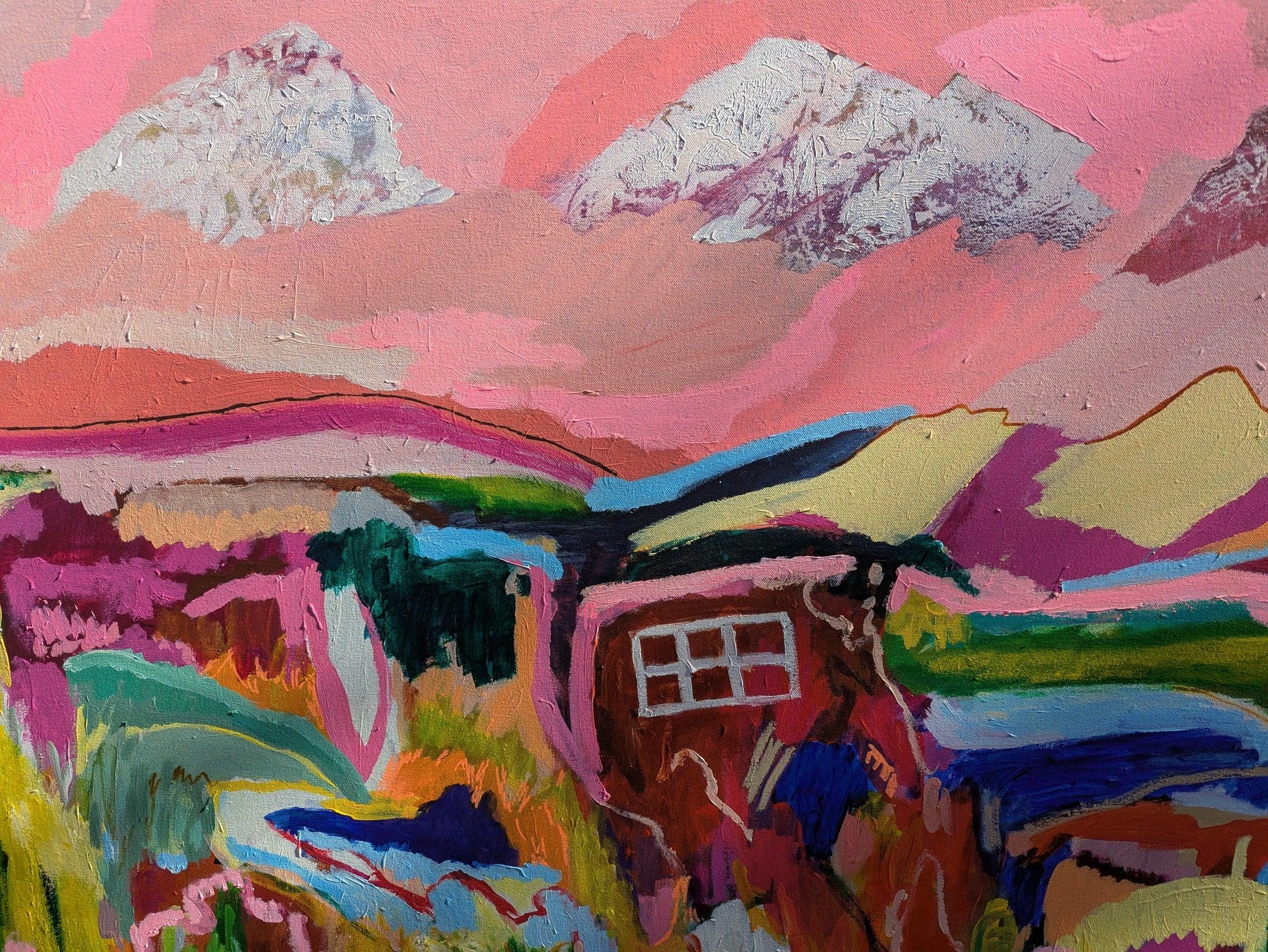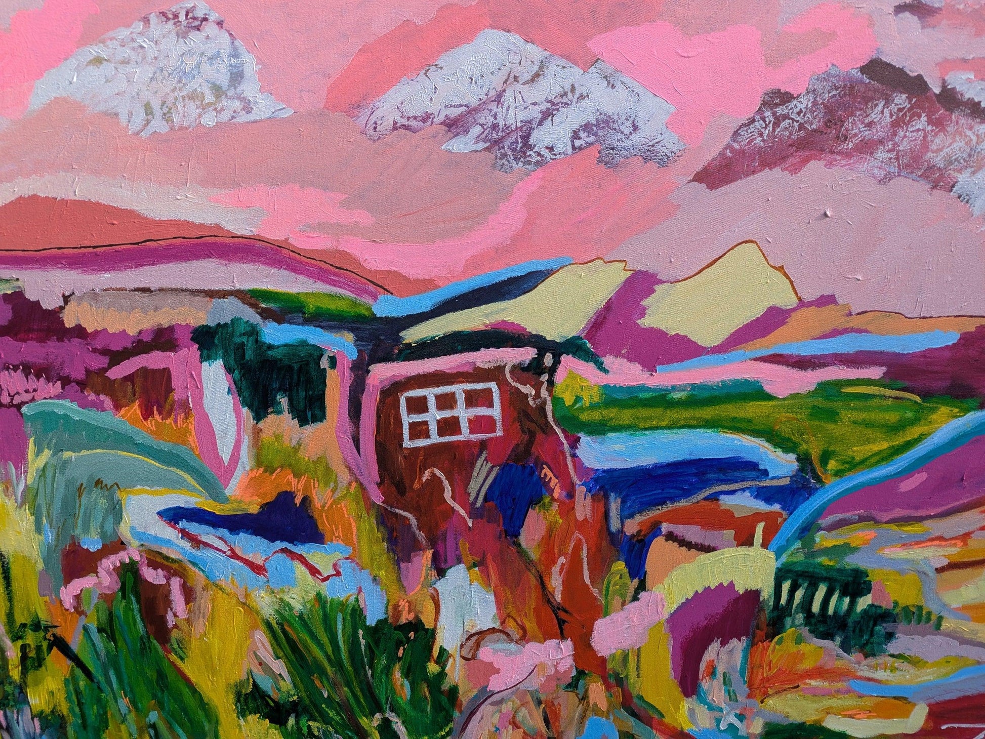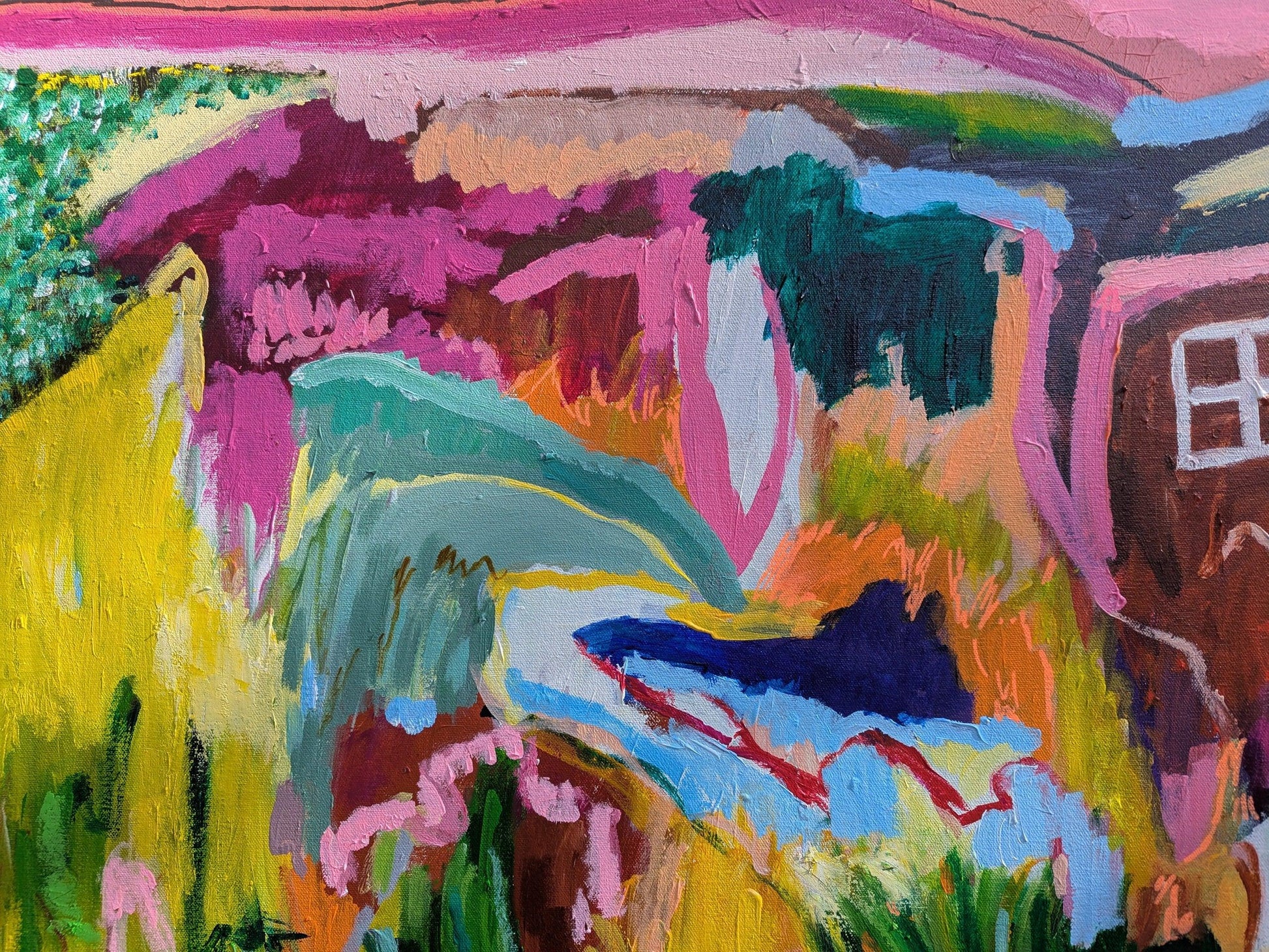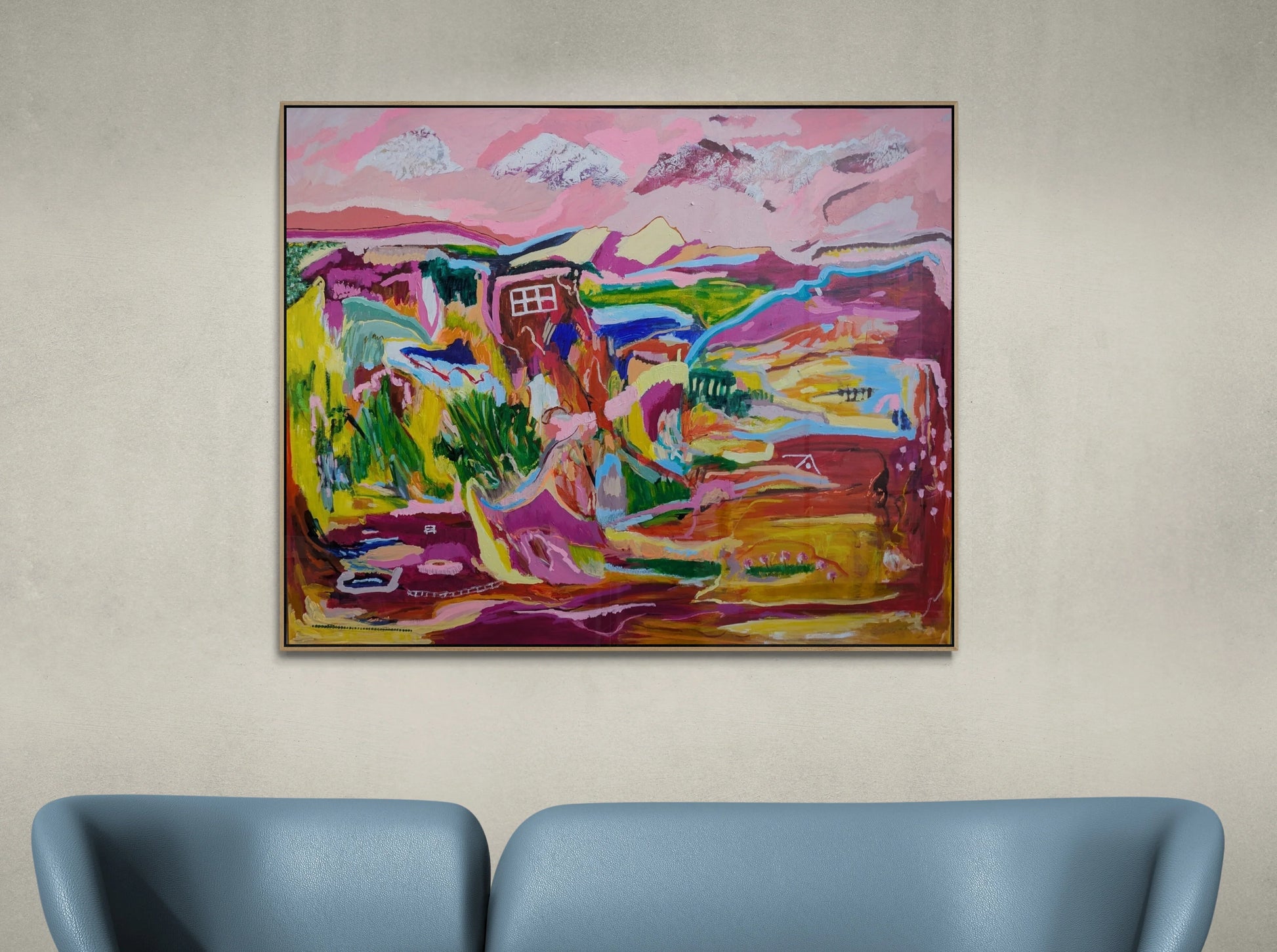 The land here is alive with echoes. Houses lean gently, as if listening to the past. Mountains glow in soft pink light, like secrets the sky never told. Every mark, every layer of acrylic and oil stick, holds the trace of something once felt — tenderness, joy, longing, silence.