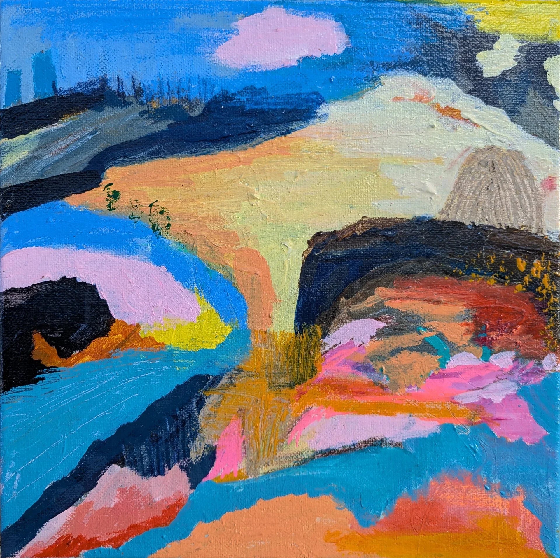 - Painting Is NOT Framed This abstract landscape by Alpana Rai captures the emotional terrain of a place felt rather than seen — a dreamlike passage between memory and imagination. Using acrylics and mixed media, she weaves vibrant bands of turquoise, pink, ochre, and midnight blue into a layered topography, inviting viewers to explore an inner world shaped by nature’s fleeting moments. The energetic brushwork and whimsical palette evoke a journey — not just across land, but into possibility, reminding us that landscapes don’t have to be real to feel true.