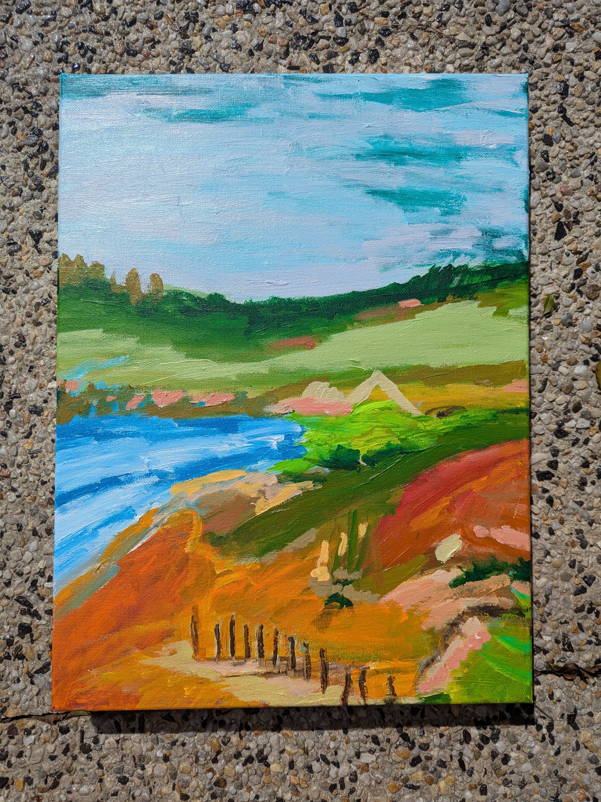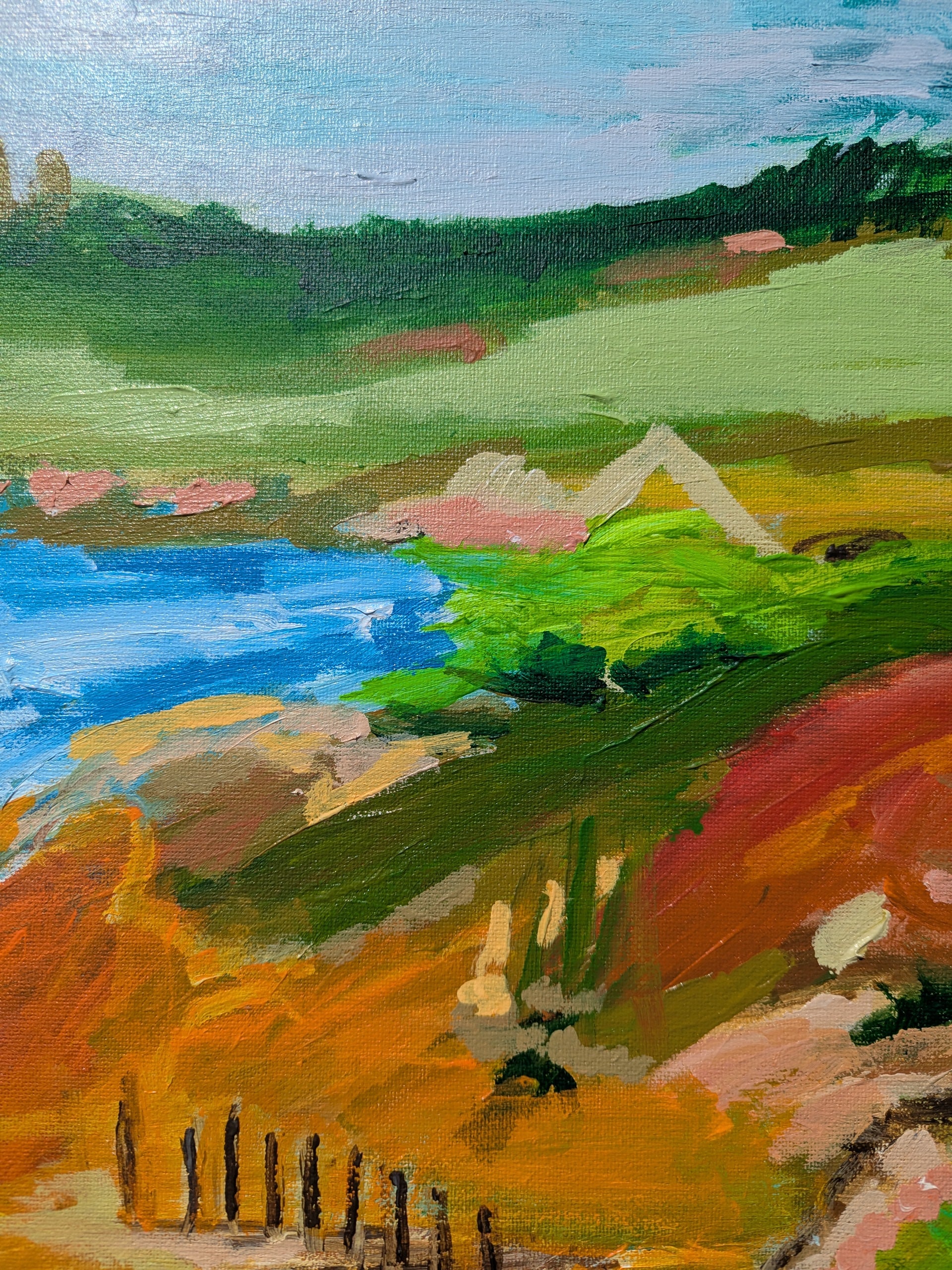In Whispers of the River Bend, Alpana Rai captures the quiet poetry of nature’s meeting places — where earth, sky, and water merge in harmony. Inspired by the Australian landscape, this artwork reflects the fluidity of rivers flowing into open skies, framed by rolling hills and warm earthy tones. The painting speaks of balance: the strength of land, the calm of water, and the promise of new horizons. With bold yet tender brushstrokes, Alpana invites the viewer to pause, breathe, and reconnect with the grounding beauty of the natural world.
