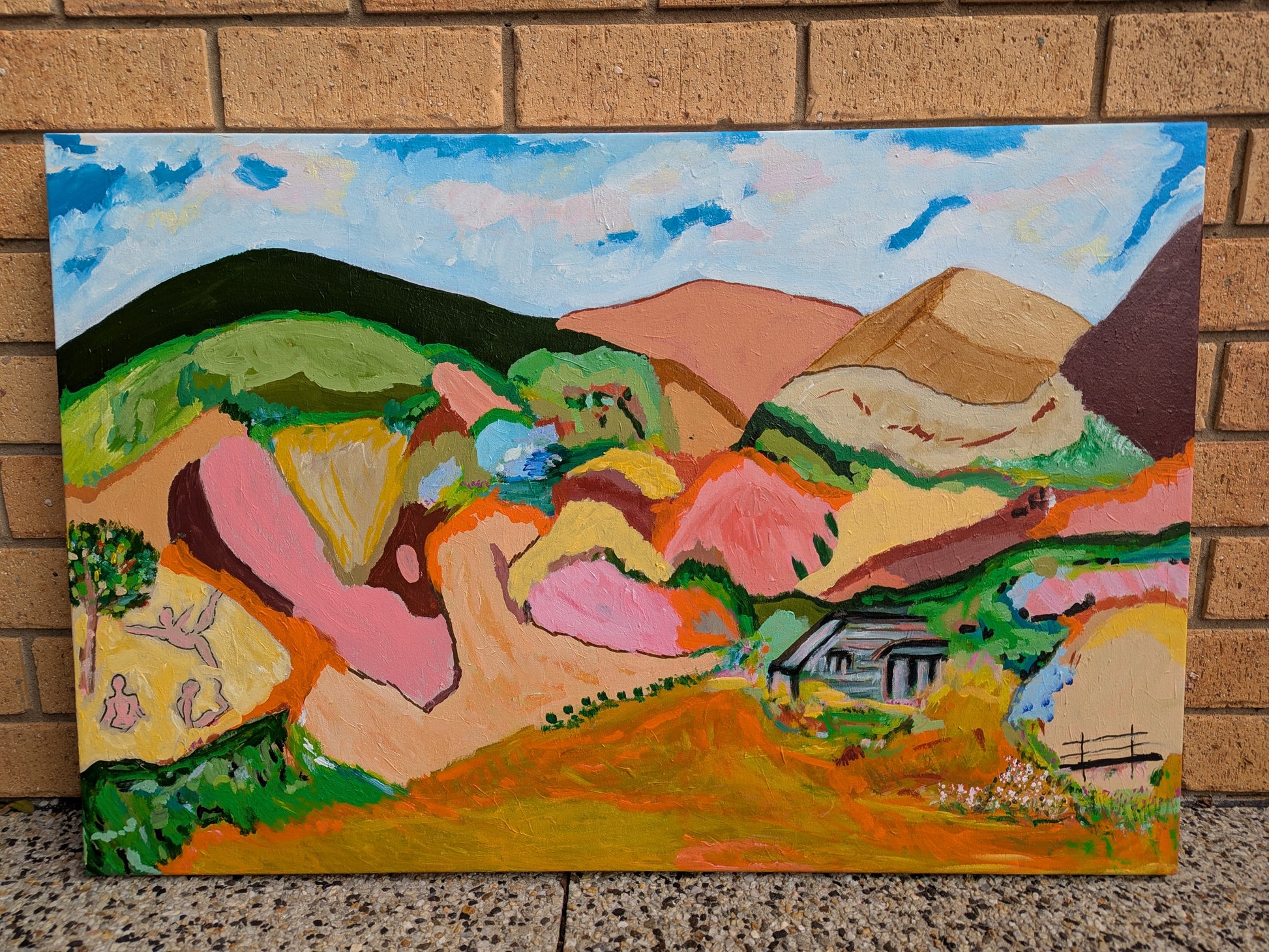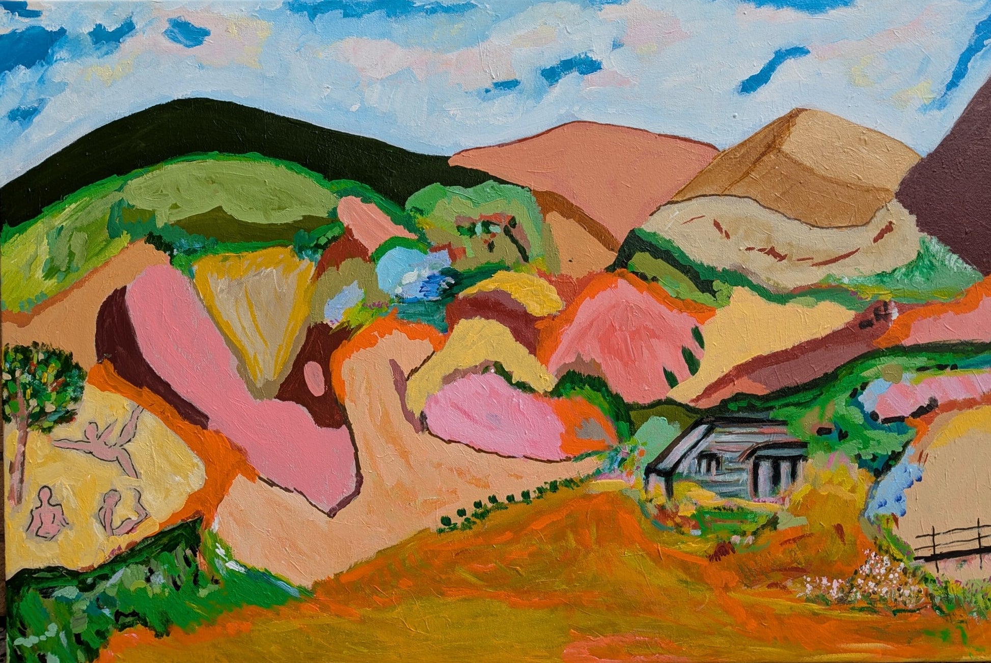 The work balances abstraction with storytelling, using bold colors and fluid forms to convey both the serenity of practice and the joy of companionship. The cottage nestled in the landscape suggests a place of retreat, while the expansive horizon evokes openness and inner peace.