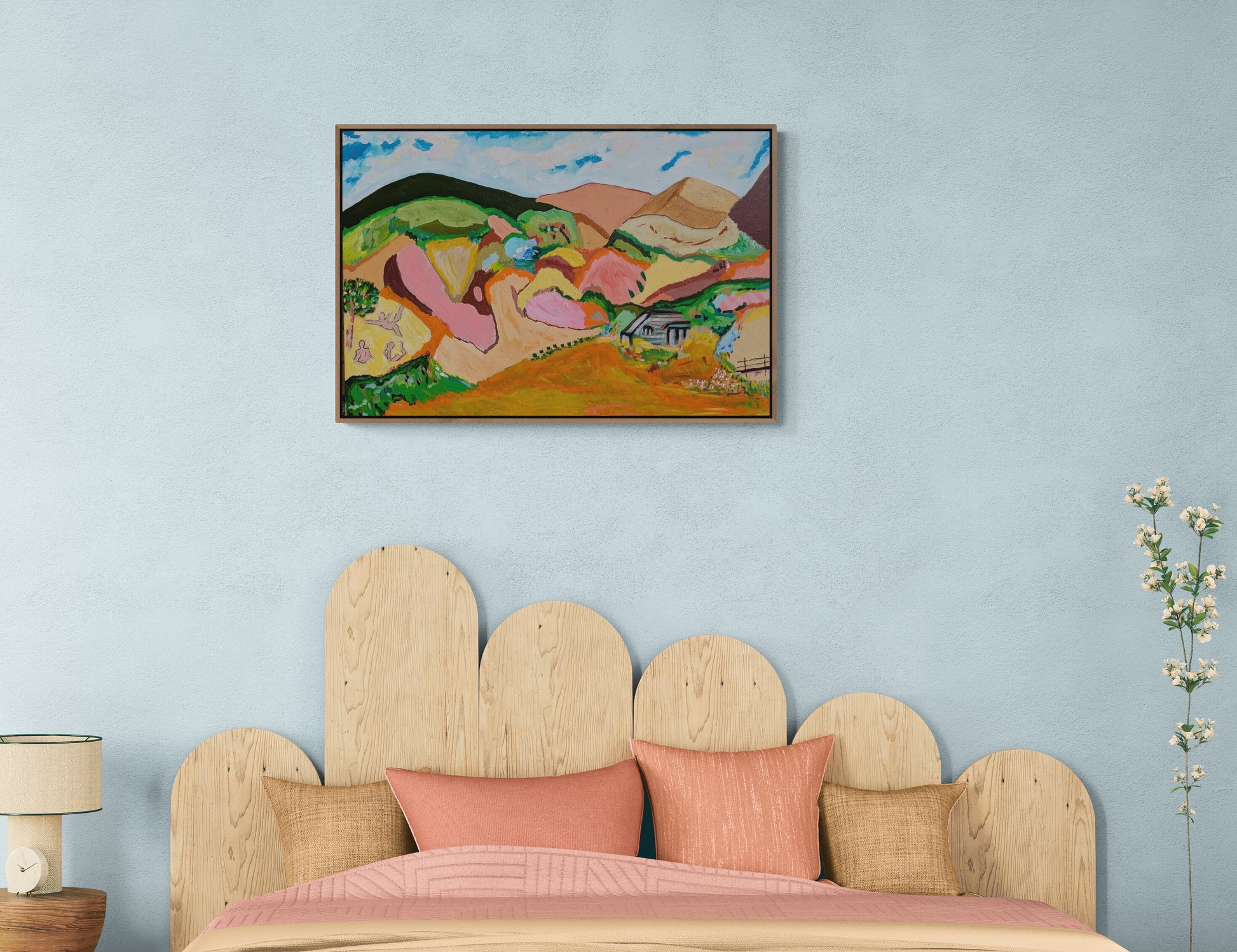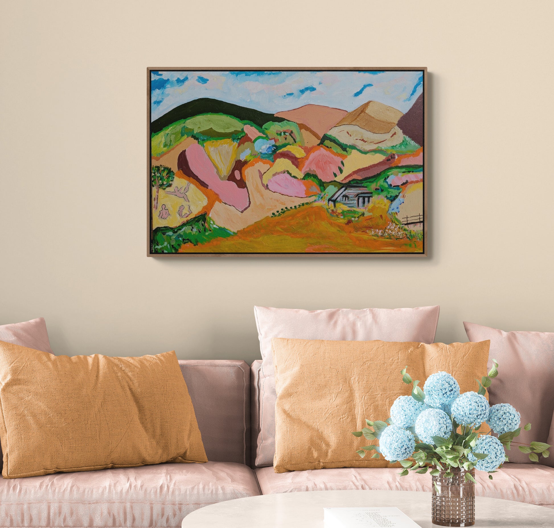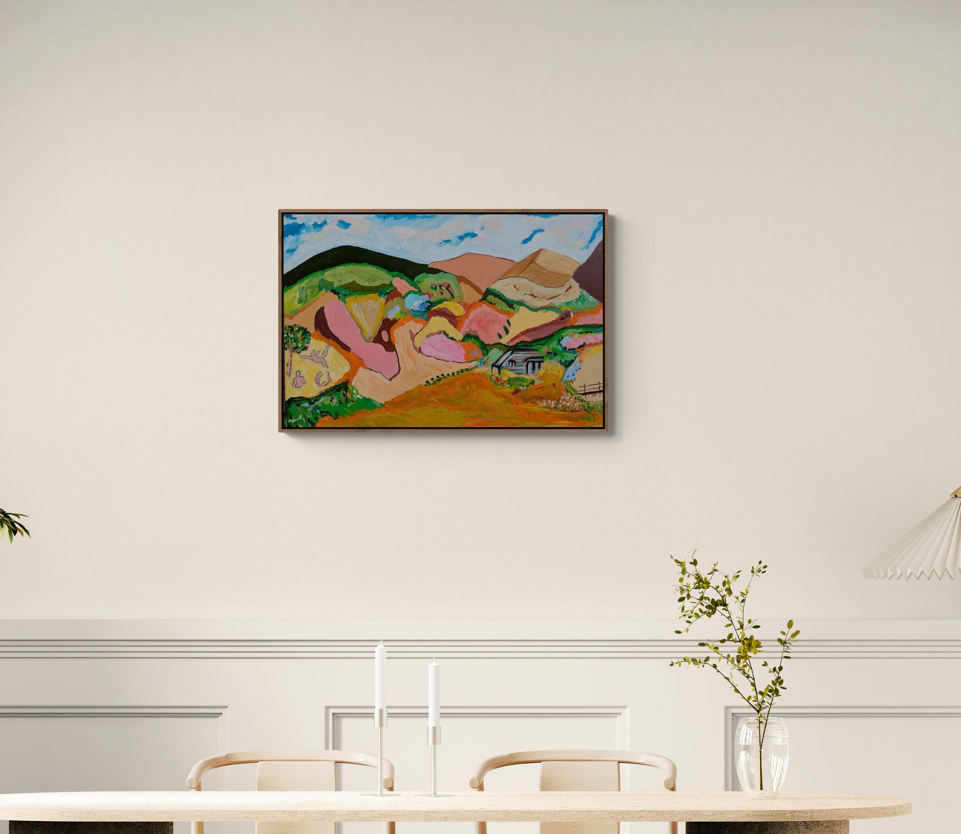 In Yoga Under the Tree With Friends, Alpana Rai captures the spirit of harmony between people and nature. The painting unfolds as a vibrant landscape of rolling hills, painted in expressive shades of pink, ochre, green, and blue. Within this colorful terrain, subtle human figures appear beneath a tree, engaged in yoga—grounded, free, and connected.